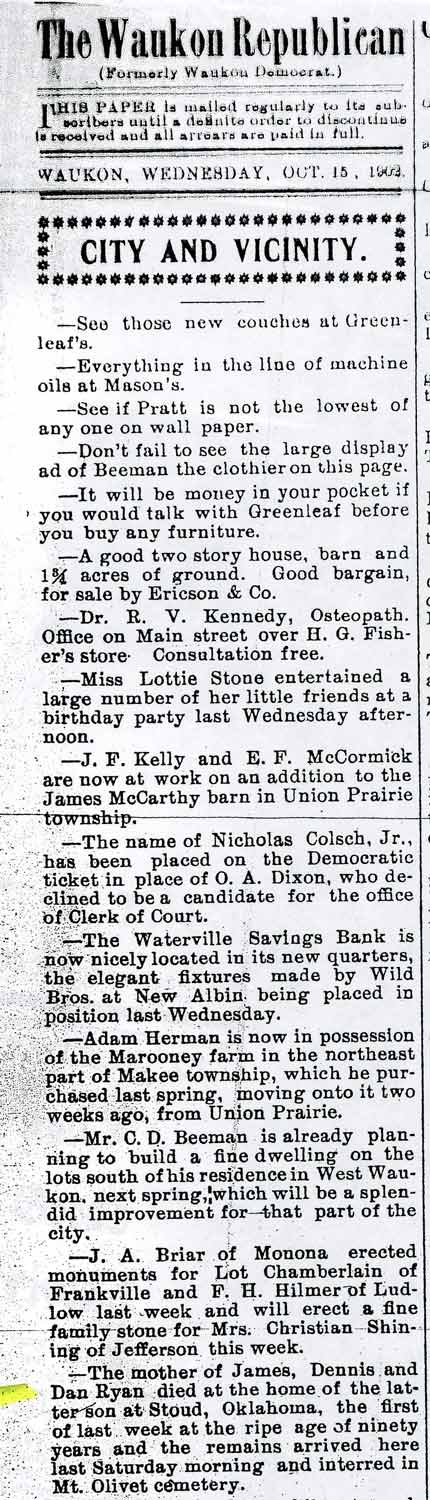 This is the only reference we could find of her death in the local Waukon newspapers. She was 90 years old at the time of her death.