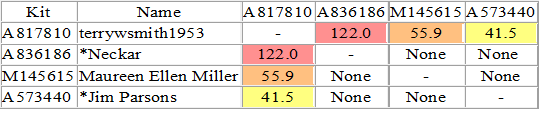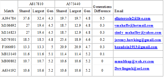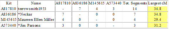 Kits that match both A817810 and A573440 which is my DNA vs. Jim Parson's DNA. Below are the closest dual cousin matches that he has with us. It suggests that our relationship with him is through our Irish ancestry: