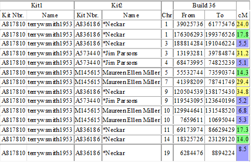 The chromosomes where we match are detailed below. These should be able to help us determine which side of the family each of these members come from (Ryan/McGonigle/Smith/Turgeon. You will see momentarily, that the McGonigle side does not appear as a close relative to the Parsons line, even though it is considered close to us. While not close, the McGonigles do share two markers with Jim Parsons.