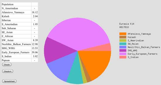 Ancient Eurasia DNA view Quick view suggests that 17.68% of our heritage comes from Siberia, 36.34% comes from an area around present day Isreal, and 44% are the combination of hunter gatherers from Scandanavia to the Mediterannean Ocean.