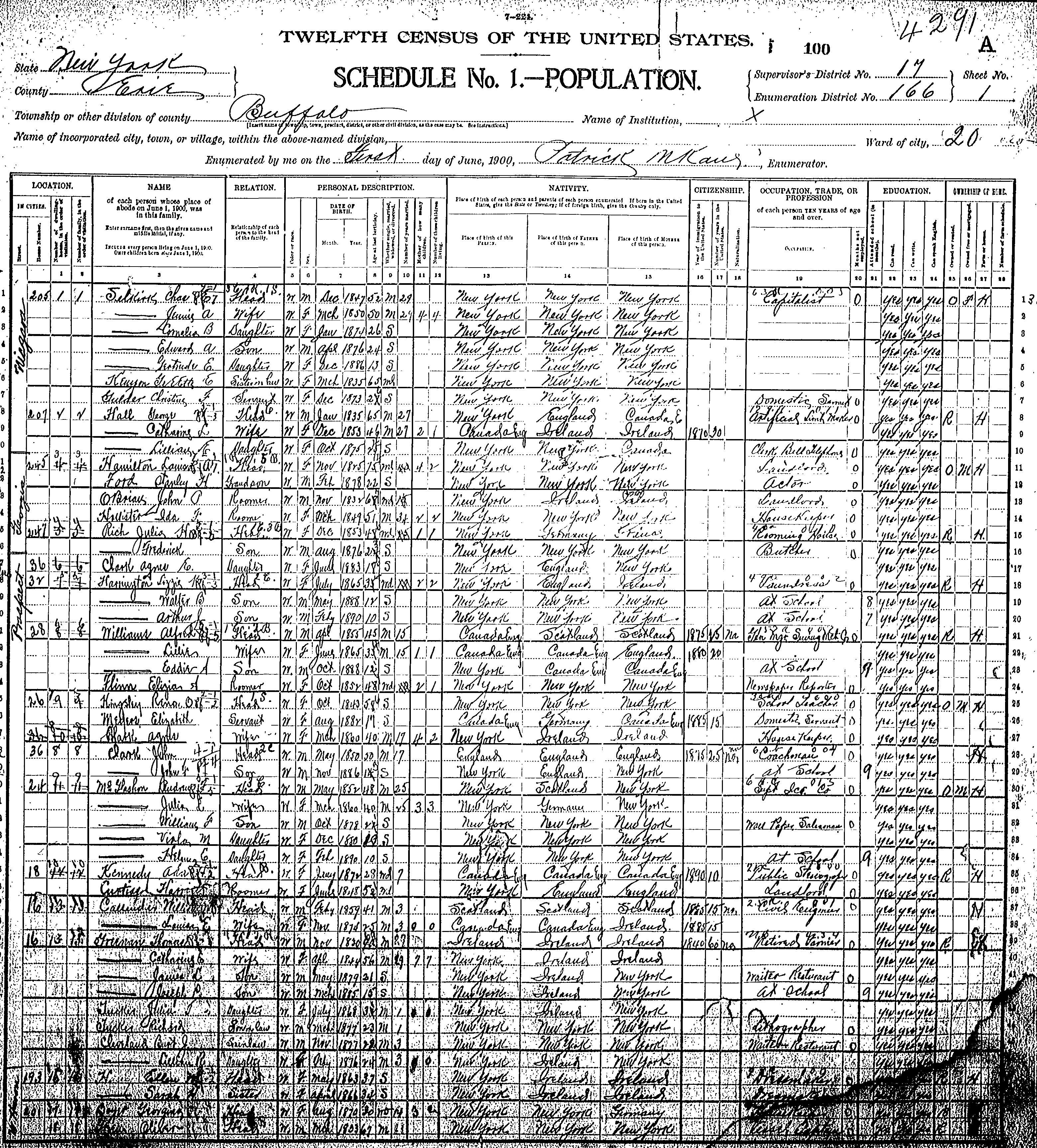 The following records are taken from various census records dated 1870 to 1910, and most relate to the Thomas Greenan family. 1910 US Census State of New York, Department of Commerce and Labor – Bureau of the Census, County Erie, Thirteenth Census of the United States: 1910 – Population, Name of Incorporated Place - Buffalo City . Enumerated by me on the 18 Day of April, 1910, Address: 88 Galewood (?)