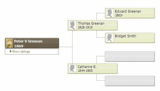 ![]() (Top) Stereoview (click to Enlarge) (Right) Peter's family line to the Monaghan Greenan family line. Click to Enalrge |