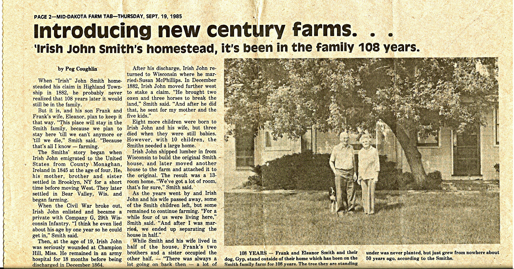 | At the time this article was written, Smiths had lived on the South Dakota farm for over 108 years. Frank and Eleanor Smith were the last "Smiths" to live on the old homestead. | |
