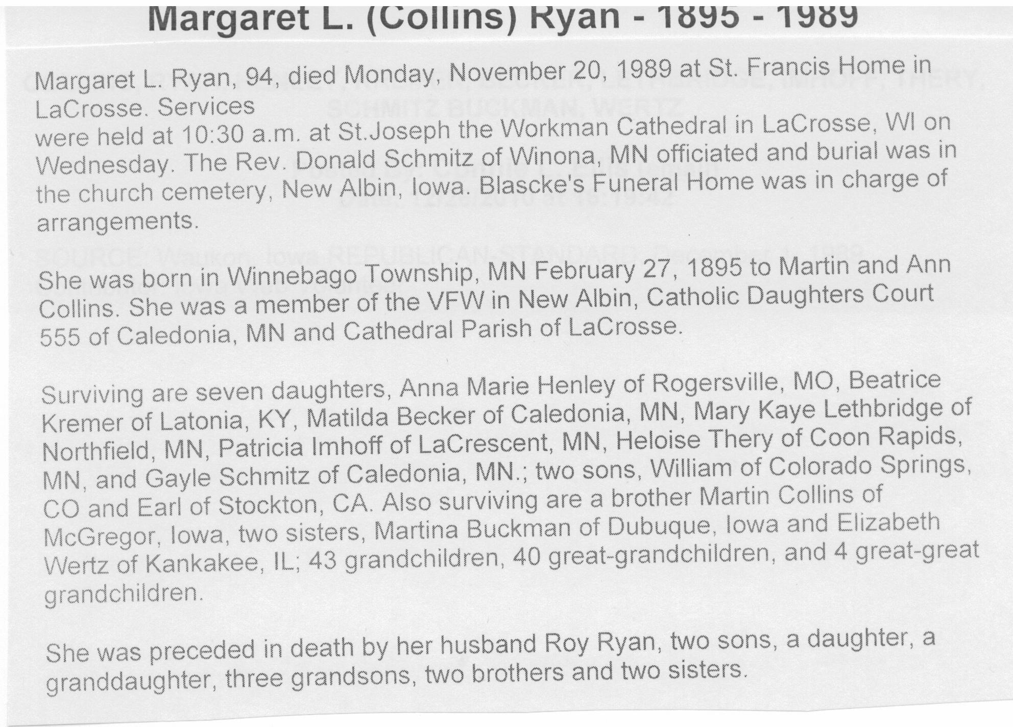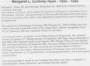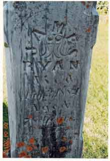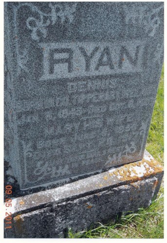James Ryan, West Ridge Cemetery, 1884 Top: The tombstone above is that of Batt Ryan's father, whom is buried in West Ridge. His wife, Nancy Ann Ryan, is most likely buried nearby...someone finally located it... Right: Dennis is the son of James and Nancy Ann Ryan. Margaret Collins was his wife, and their marker is located in Houston County, Minnesota. |