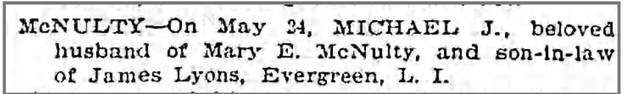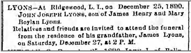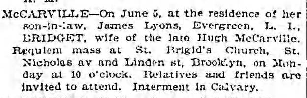 The following articles are about the Lyons and McCarville families of Brooklyn, New York. In Irish John Smith's journals, he mentioned that he stayed with his cousin Catherine Lyons. The relationship to our family is through Catherine's mother. Catherine's mother was a sister to John Smith's mother, Catherine Greenan Smith Rooney.
