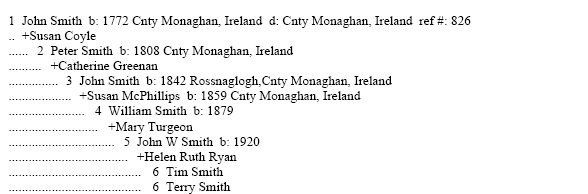 ![]() This chart provided by Bob and Louisa Wallace, Downers Grove, Illinois. Louisa's mother was Bridget Smith, niece of Patrick Smith. Patrick has been mentioned in earlier documents, as he lived with the Irish John Smith family in the early 20th century. |