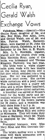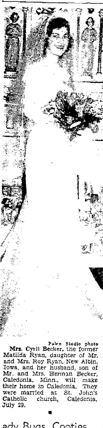 ![]() Mrs. Cyril Becker, formerly Matilda Becker, daughter of Roy and Margaret Ryan. 1950 Heloise Mary Ryan and Frederick Thery wedding. Click to Enlarge for "rest of the story". |
