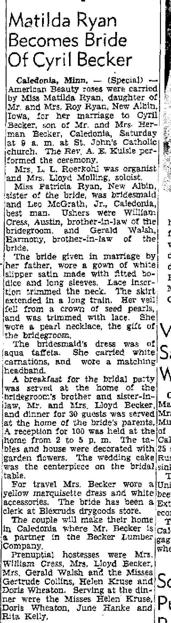 Matilda Becker Full 1950 wedding write-up. Click to Enlarge. |